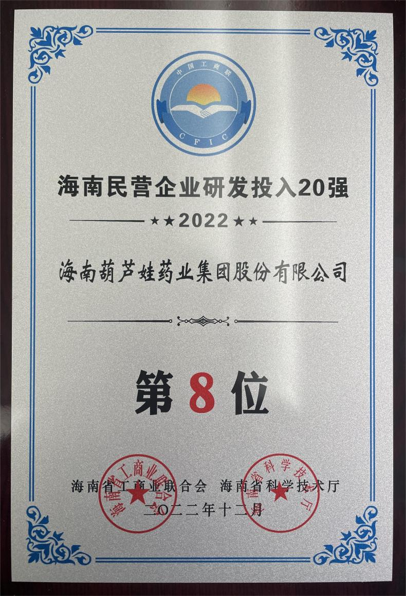 12月23日,2022海南民营企业50强和研发投入20强发布会在海口举行。会上发布了“2022海南民营企业50强”“2022海南民营企业研发投入20强”榜单和分析报告。3044am永利药业再次荣登两榜,在海南民营企业50强榜单中位列第25位,较去年上升8位,这也是公司连续三年登榜;在海南民营企业研发投入20强中位列第8位,较去年上升7位。